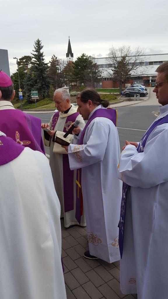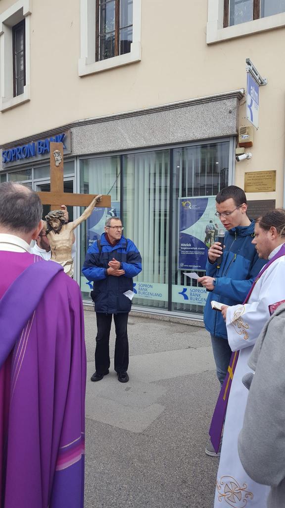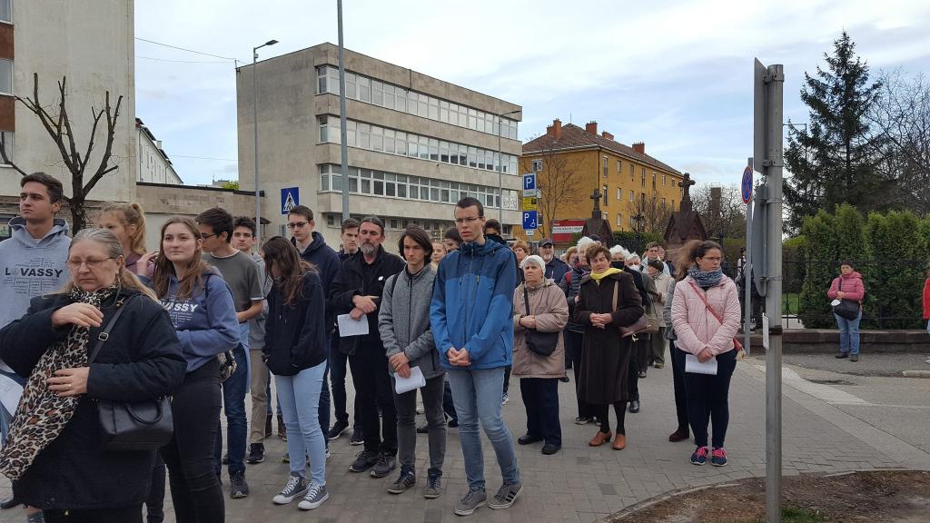 A 17 órai szentmise után, melyet Dr. Udvardy György érsek atya mutatott be a Károly templomban, indult a keresztút a Várban lévő Szentháromság szoborhoz. A keresztúton olvasással és kereszthordozással vállaltunk szolgálatot.